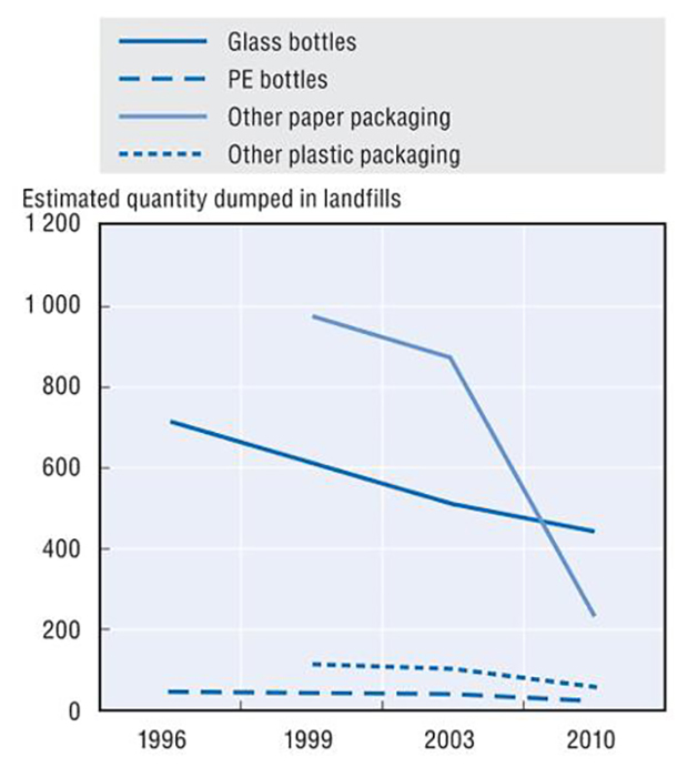 日(rì)本各類包裝類廢棄物的填埋量(OECD, 2016)