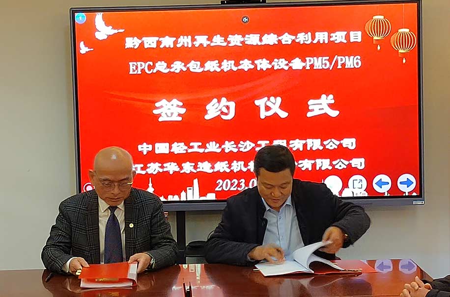 我司和中國輕工業長沙工程有限(xiàn)公司簽(qiān)訂黔(qián)西南州再生資源綜合利用EPC總(zǒng)承包紙機本體(tǐ)設備PM5/PM6項(xiàng)目(mù)